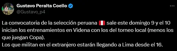 El periodista Gustavo Peralta reveló que la convocatoria de la selección peruana se realizará el domingo 9 de marzo. Los entrenamientos en la Videna comenzarán el lunes 10, inicialmente con los jugadores del torneo local. Los futbolistas que militan en el extranjero se unirán al equipo a partir del 16 de marzo.