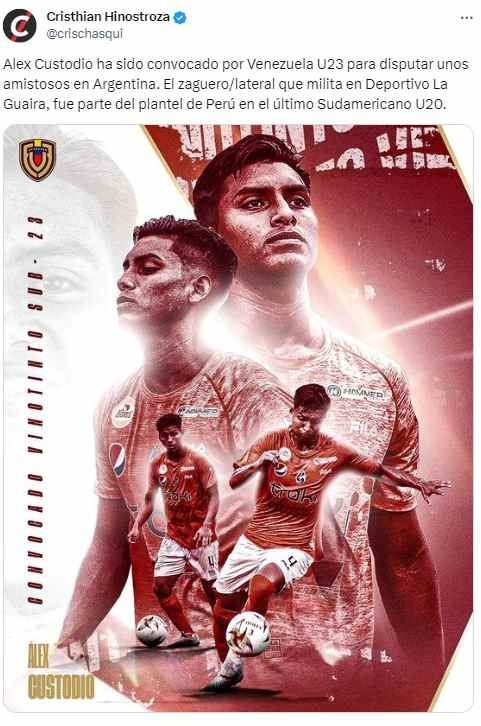 Sin embargo, hoy la Federación Peruana de Fútbol (FPF) recibió una mala noticia con un jugador que ya había representado antes a la Bicolor. Se trata de Álex Custodio, de padre peruano y madre venezolana, que ya ha pertenecido a la selección Sub-20 de la Blanquirroja como lateral derecho, pero acaba de aceptar el llamado por la selección de Venezuela debido a que Guillermo del Solar no lo convocara para la Blanquirroja de Sub-23 pensando en el Preolímpico 2024.