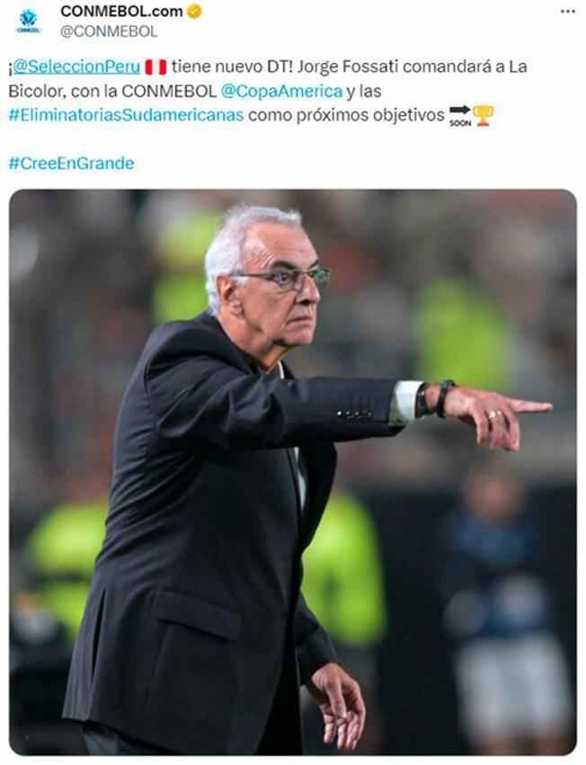 Cuando salió esta noticia, inmediatamente la Conmebol, máximo rector del fútbol en Sudamérica, resalto la incorporación. “¡Selección Peruana tiene nuevo DT! Jorge Fossati comandará a la Bicolor, con la Conmebol Copa América y las Eliminatorias Sudamericanas como próximos objetivos”, compartió el ente por medio de su cuenta de ‘X’ (antes Twitter).