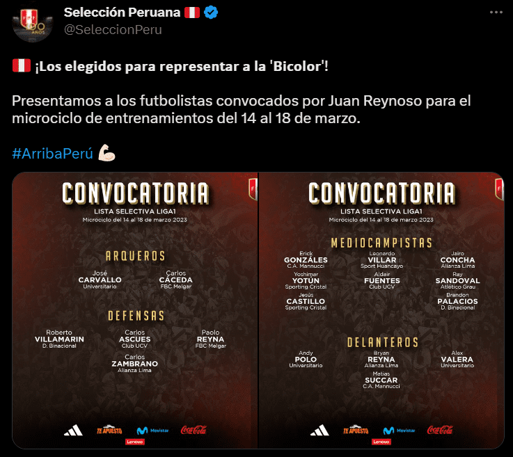 En la mayoría resaltan futbolistas de la Liga 1, de los que destacan Paolo Reyna (Melgar), Roberto Villamarín (Binacional), Jesús Castillo (Sporting Cristal), Bryan Reyna (Alianza Lima) y Matías Succar (Carlos Mannucci). Con un nuevo proceso y las miras puestas en Alemania y Marruecos el próximo 25 y 28 de marzo respectivamente, Reynoso ya empezó con el recambio generacional.