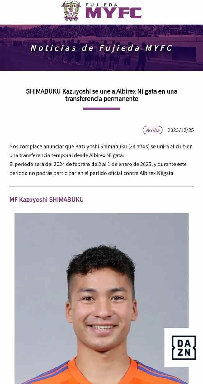 Según la web Fujieda MYFC, el atacante acaba de llegar a ese club de la segunda división de Japón. “Nos complace anunciar que Kazuyoshi Shimabuku (24 años) se unirá al club en una transferencia temporal desde Albirex Niigata. El periodo será del 2024 de febrero de 2 al 1 de enero de 2025, y durante este periodo no podrás participar en el partido oficial contra Albirex Niigata”, compartió el portal.