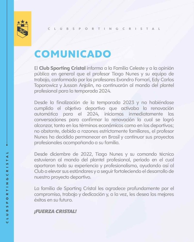“Desde diciembre de 2022, Tiago Nunes y su comando técnico estuvieron al mando del plantel profesional, periodo en el cual aportaron toda su experiencia y profesionalismo, ayudando así al club a elevar sus estándares y a seguir fortaleciendo el desarrollo de nuestro proyecto deportivo. La familia de Sporting Cristal les agradece profundamente por el compromiso, trabajo y dedicación y, a la vez, les desea los mejores éxitos en su futuro”, puntualizó el equipo.