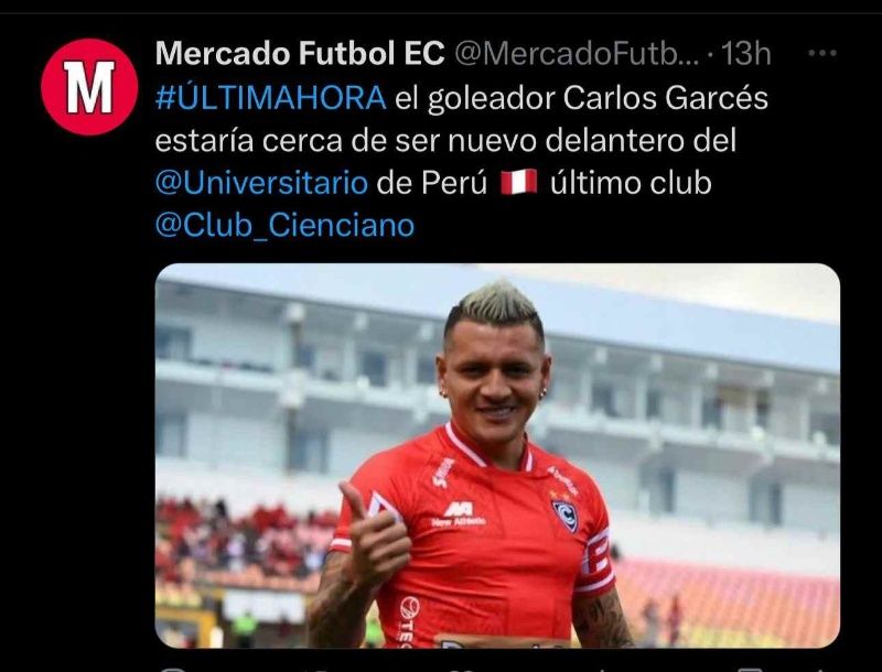 Según Mercado Fútbol EC, se trata Carlos Garcés, actual jugador del Cienciano del Cusco que marcó 16 goles y brindó 2 asistencias en toda la temporada pasada. El atacante tuvo pasos por grandes equipos de Ecuador como LDU de Quito, Delfín y Barcelona SC. En este último club fue donde conoció al actual defensor de la U. Sin duda es una apuesta que garantiza goles en la delantera merengue y puede darle mucha competencia Alex Valera para el centenario.