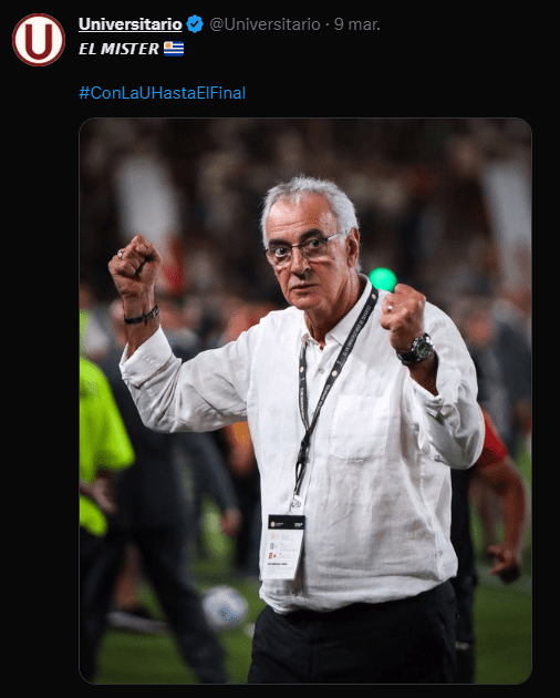 Con varios gestos y señas, el DT demostró que le importa el equipo y que quiere dejar varias enseñanzas en el club. Su gran historial lo avala y contra el equipo cusqueño se demostró. Gracias a ello, Universitario no pudo estar más que satisfecho y, través de sus redes sociales, postearon ‘El Mister’, con referencia a al estratega.
