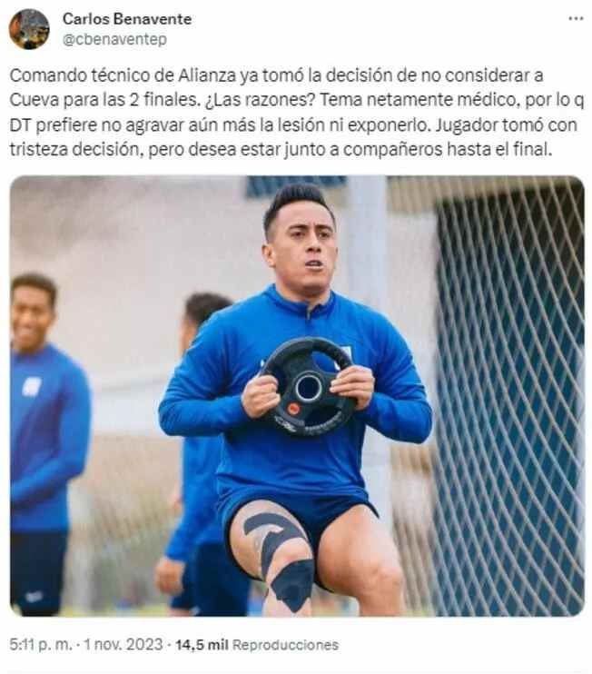 El periodista Carlos Benavente reveló la noticia por medio de sus redes sociales. "Comando técnico de Alianza ya tomó la decisión de no considerar a Cueva para las 2 finales. ¿Las razones? Tema netamente médico, por lo que DT prefiere no agravar aún más la lesión ni exponerlo”, sostuvo el comunicador.