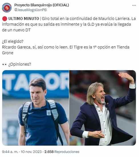 La situación se habría complicado tanto que sus horas estarían contadas en Alianza Lima. Según el periodista Jesús Mogollón, su salida es inminente. “Giro total en la continuidad de Mauricio Larriera. La información es que su salida es inminente y la G.D ya evalúa la llegada de un nuevo DT”, publicó el comunicador en su Twitter.