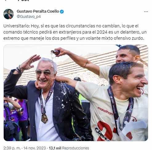 “Universitario: Hoy, si es que las circunstancias no cambian, lo que el comando técnico pedirá en extranjeros para el 2024 es un delantero, un extremo que maneje los dos perfiles y un volante mixto ofensivo zurdo”, escribió el comunicador en la red social ‘X’, antes llamada Twitter.