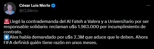 La información que sostiene el periodista César Luis Merlo va mucho más allá que un conflicto particular. El dinero que está de por medio afecta no solo al jugador, sino también al club, al que el Al-Fateh acusa de ser responsable solidario. En la contrademanda interpuesta por los árabes, especifican y solicitan un monto de 1.963 millones de dólares.