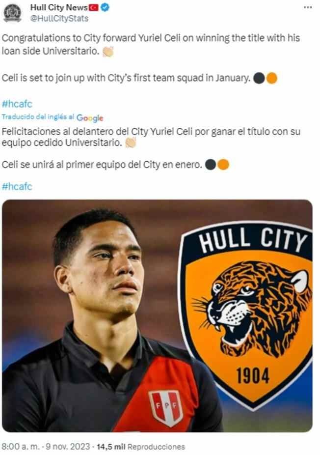 El medio inglés ‘Hull City News’ hizo una publicación en sus redes sociales, donde felicitaba al volante y a la vez anunciaba su regreso al equipo inglés en enero de 2024. “Felicitaciones al delantero de Hull City, Yuriel Celi, por ganar el título con su equipo cedido Universitario. Yuriel Celi se unirá al primer equipo del City en enero", publicó el medio especializado en ‘X’ (antes Twitter).