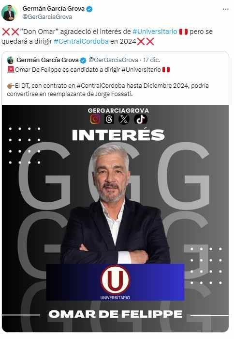 Ahora, en la búsqueda de un nuevo DT volvieron a recibir el ‘no’. Se trata del estratega Omar de Felippe, que dirige Central Córdova. Hace unos días, el periodista deportivo argentino, Germán García, reveló que el entrenador era candidato de la directiva de Universitario ante la prematura salida de Jorge Fossati. Sin embargo, hoy mismo el periodista mencionó que ‘Don Omar’ prefirió quedarse en el equipo argentino. “‘Don Omar’ agradeció el interés de Universitario, pero se quedará a dirigir Central Córdoba en 2024”, publicó el comunicador por medio de su cuenta de ‘X’ (antes llamado Twitter). Apuesta en Betsson a los partidos de las mejores ligas del mundo y recibe un bono de bienvenida de 50 soles.