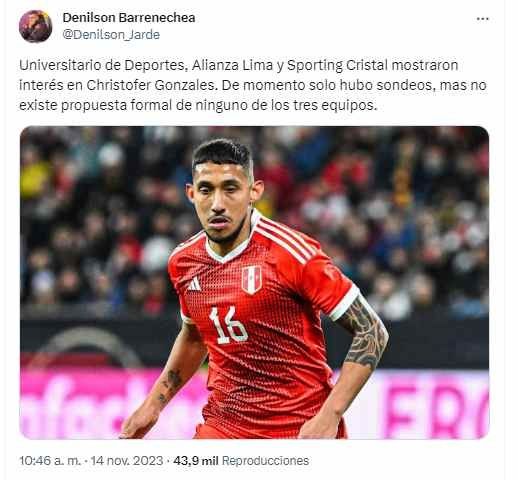 “Universitario de Deportes, Alianza Lima y Sporting Cristal mostraron interés en Christofer Gonzales. De momento solo hubo sondeos, mas no existe propuesta formal de ninguno de los tres equipos”, publicó el comunicador por medio de su cuenta de ‘X’ (antes Twitter).