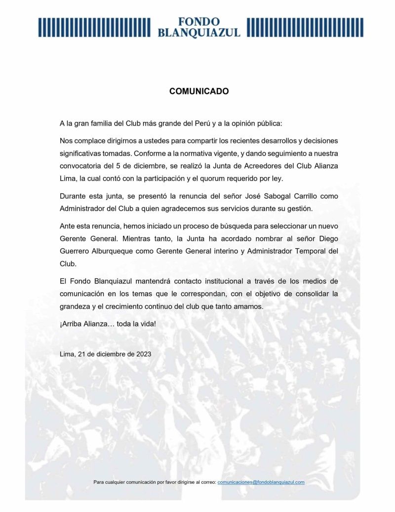 “Durante esta junta, se presentó la renuncia del señor José Sabogal Carrillo como Administrador del Club a quien agradecemos sus servicios durante su gestión. Ante esta renuncia, hemos iniciado un proceso de búsqueda para seleccionar un nuevo Gerente General. Mientras tanto, la Junta ha acordado nombrar al señor Diego Guerrero Alburqueque como Gerente General interino y Administrador Temporal del Club”, decía el documento.