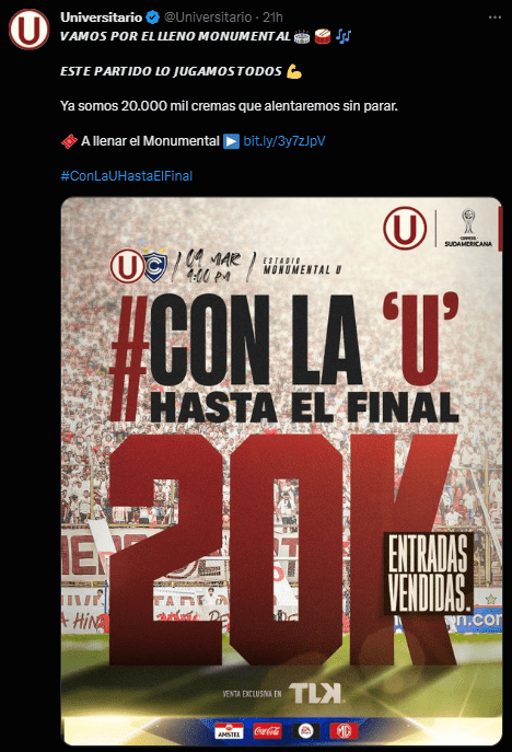 El día esperado se acerca para la ‘U’ y los hinchas respondieron con creces en la venta entradas. Hasta la fecha, según las redes sociales del club crema, ya se han vendido por lo menos 20 mil boletos para el duelo de este jueves ante Cienciano. El Monumental será el escenario que presenciará el duelo por la primera fase de la Sudamericana.