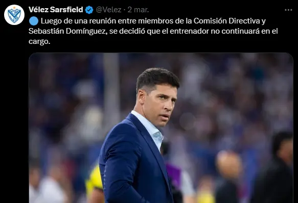 "Luego de una reunión entre miembros de la Comisión Directiva y Sebastián Domínguez, se decidió que el entrenador no continuará en el cargo", informó el club argentino. La destitución de Domínguez se produce en un momento crucial, a poco del inicio de la fase de grupos de la Copa Libertadores 2025, a la que Vélez Sarsfield clasificó como campeón de la Liga Profesional Argentina.