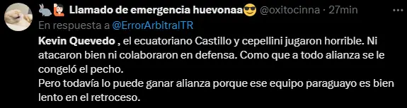 "Kevin Quevedo, el ecuatoriano Castillo y Cepellini jugaron horrible. Ni atacaron bien ni colaboraron en defensa. Como que a todo Alianza se le congeló el pecho."