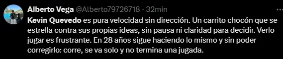 "Kevin Quevedo es pura velocidad sin dirección. Un carrito chocón que se estrella contra sus propias ideas, sin pausa ni claridad para decidir. Verlo jugar es frustrante. En 28 años sigue haciendo lo mismo y sin poder corregirlo: corre, se va solo y no termina una jugada."