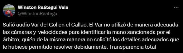 Tras la revelación de los audios del VAR, Winston Reátegui, presidente de la Comisión Nacional de Árbitros (Conar), se pronunció a través de sus redes sociales para admitir los errores arbitrales. "Salió el audio VAR del gol en el Callao. El VAR no utilizó de manera adecuada las cámaras y velocidades para identificar la mano sancionada por el árbitro, quién de la misma manera no solicitó los detalles adecuados que le hubiesen permitido resolver debidamente. Transparencia total", publicó Reátegui en su cuenta de X (antes Twitter).