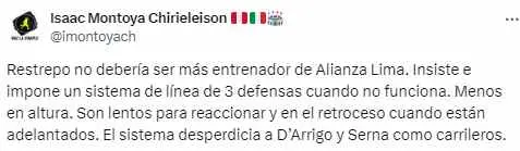 “Restrepo no debería ser más entrenador de Alianza Lima. Insiste e impone un sistema de línea de 3 defensas cuando no funciona. Menos en altura. Son lentos para reaccionar y en el retroceso cuando están adelantados. El sistema desperdicia a D’Arrigo y Serna como carrileros”, sostuvo el periodista Isaac Montoya Chirieleison por medio de su cuenta de ‘X’ (antes Twitter).