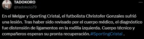 "En el partido entre Melgar y Sporting Cristal, el futbolista Christofer Gonzales sufrió una lesión. Tras haber sido revisado por el cuerpo médico, el diagnóstico fue distensión de ligamentos en la rodilla izquierda. Cuerpo técnico y compañeros esperan su pronta recuperación", indicó Robles en su cuenta oficial de 'X'.