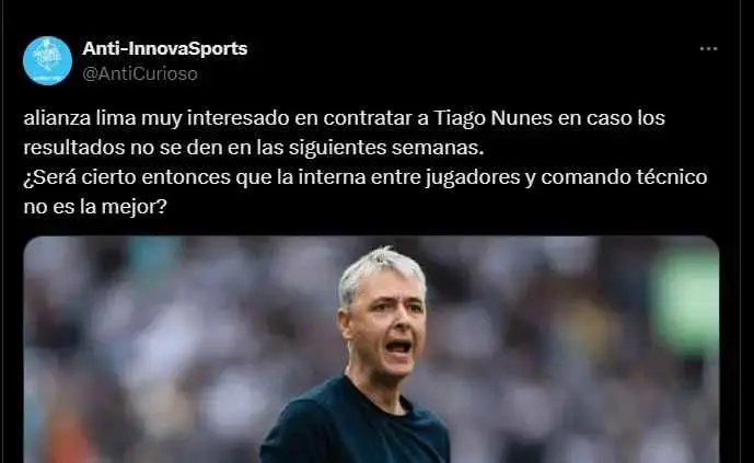 En esta línea, hace unas horas se supo que la gerencia deportiva del conjunto victoriano ya tiene un ‘plan b’ en caso de que se despida Restrepo. Al parecer, en Alianza Lima se han fijado en un ex DT de Sporting Cristal, Tiago Nunes. “Alianza Lima muy interesado en contratar a Tiago Nunes en caso los resultados no se den en las siguientes semanas. ¿Será cierto entonces que la interna entre jugadores y comando técnico no es la mejor?”, sostuvo la web Anti-InnovsSports.