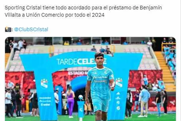 Según el periodista Delinson Barrenechea, Benjamin Villalta no será parte del plantel de Sporting Cristal para el 2024 debido a que será prestado a Unión Comercio. “Información para @apresion1: Sporting Cristal tiene todo acordado para el préstamo de Benjamín Villalta a Unión Comercio por todo el 2024”, publicó el comunicador por medio de su cuenta de ‘X’ (antes Twitter). Apuesta en Betsson a los partidos de las mejores ligas del mundo y recibe un bono de bienvenida de 50 soles.