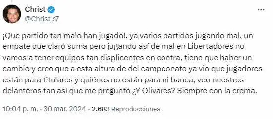 Sumando todos estos errores, la hinchada está preocupada con el debut de la U en la Copa Libertadores el próximo martes 2 de abril ante LDU de Quito . “¡Qué partido tan malo han jugado! Ya varios partidos jugando mal, un empate que claro suma, pero jugando así de mal en Libertadores no vamos a tener equipos tan displicentes en contra, tiene que haber un cambio y creo que a esta altura del campeonato ya se vio qué jugadores están para titulares y quiénes no están ni para la banca”, fue uno de los comentarios más viralizados en 'X'.